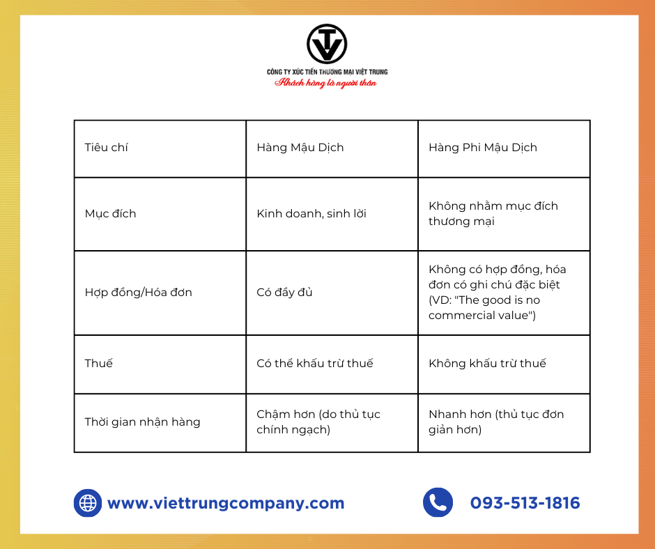 Hàng mậu dịch và phi mậu dịch đều đóng vai trò quan trọng trong hoạt động xuất nhập khẩu, nhưng có những điểm khác biệt rõ rệt về mục đích, thủ tục, và ứng dụng. Hiểu rõ sự khác biệt này sẽ giúp doanh nghiệp lựa chọn hình thức kinh doanh phù hợp, tránh rủi ro pháp lý. Nếu bạn cần hỗ trợ nhập hàng Trung Quốc hoặc giải quyết thủ tục hải quan, hãy liên hệ ngay với Việt Trung Company để nhận tư vấn chuyên sâu và dịch vụ chất lượng nhất!