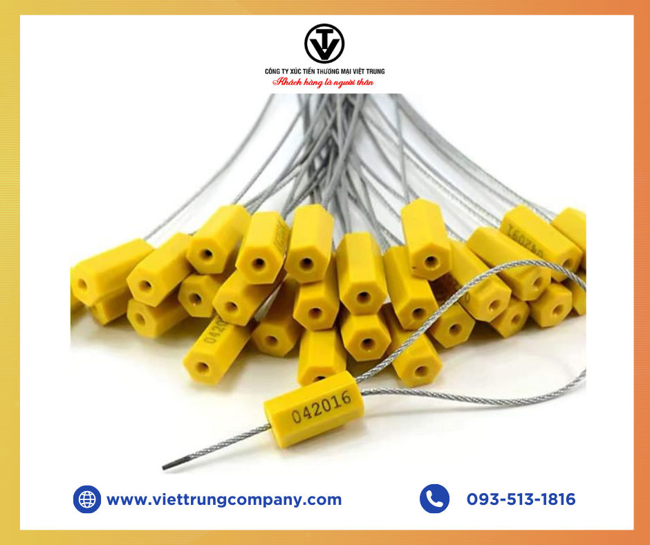 Kẹp chì niêm phong dây khóa lục giác (cáp bấm đầu nhựa): Seal cáp bấm đầu nhựa là một dây khóa cáp được sử dụng phổ biến hơn so với seal cối, ngoài kẹp chì container thì dây khóa lục giác đầu nhựa còn được sử dụng để niêm phong các xe tải chở hàng, kẹp chì xe tải, táp lô xe ô tô, rất chắc chắn và an toàn.